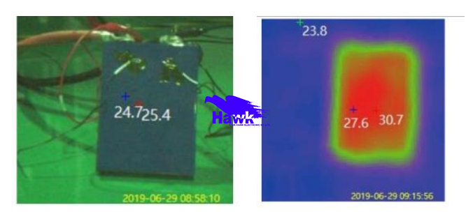 二、汽车蓄电池生产 在电池研发或生产过程中,需要进行充放电等有明显温度特征的试验 • 热电偶、点温仪等单点测温仪器检测不够全面,无法追踪到最高温位置,容易出现漏检。 • 热像仪作为面测温,且具有高度自动化的仪器,能够准确高效的发现温度异常。根据场景的需求,用户可选择手持与在线式热像仪。 使用在线式测温热像仪,将其视角正对电池,触点处设置测温方框,将电池正常运行的最高温度设置为报警值,出现不良时立即报警。 产品特点: 可检测整面温度,确定最高温度以及所在位置 圈定检测触电处温度,快速发现线路方面问题 自动实时监控,测试过程只需较少人力看管 双光观测,可快速找到异常温度点