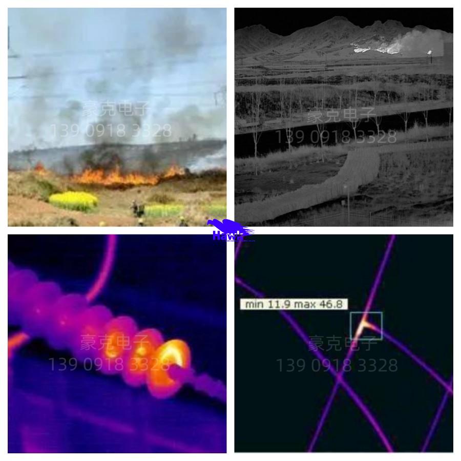四、应用效果 线夹、接头缺陷监测 检测导线线夹发热,通过热像仪所测得的温度提前发现潜在故障做出故障预警,提示工作人员及时采取排障措施。 绝缘子缺陷监测 检测并发现早期绝缘子表面污秽,受潮和劣化现象,及时处理。 山火预警 在火点早期温度攀升阶段,准确检测出温度异常,及早进行火点预警,精准判断火点位置。