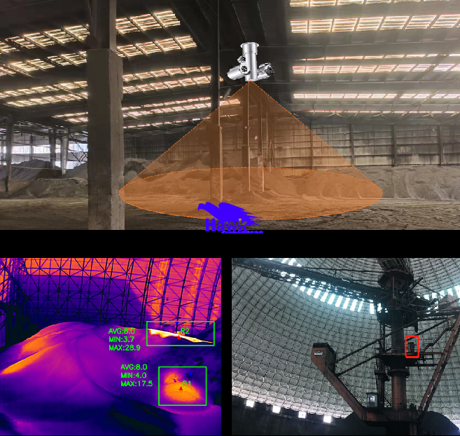 二、热成像监测的技术优势 非接触式全面监测 热成像仪通过检测物体表面红外辐射,生成温度分布图像,可实时覆盖整个原料堆、设备或生产线,无需接触被测物体,避免干扰生产流程。 高精度与快速响应 精度可达±2℃或更高,响应时间短至毫秒级,能及时发现温度异常(如局部过热、泄漏点),为事故预防争取时间。 全天候工作能力 不受光照、烟雾或灰尘影响,可在夜间、强光或恶劣天气下清晰成像,确保监测连续性。 智能化预警与数据分析 系统可自定义报警阈值(如超温、温升速率),自动触发声光报警或联动消防设备;支持历史数据存储与分析,优化工艺参数。