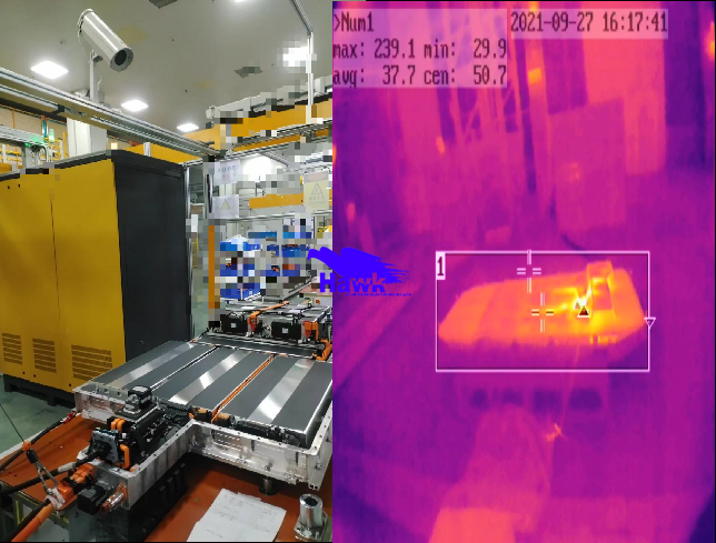 动力电池的起火、爆炸等安全性问题一直是新能源汽车行业关注的头等大事。动力电池在使用过程中,因为碰撞、挤压、穿刺、振动等外力机械作用,和电池外短路、过充电、过放电等电气滥用,以及内部短路等电池质量故障,动力锂电池组会发生热失控现象,造成动力电池起火、爆炸的安全性问题。 因此,为了提升动力电池组的安全性,在电池组加入热失控监测预警和阻断系统,减少电池组热失控的危害。 生产过程监控应用 1.生产线自动化监测应用 在测试产线上方,安装在线测温热像仪TN460+防爆外壳,实现对产线绝缘测试过程的实时监测,温度数据+视图保存测试过程;