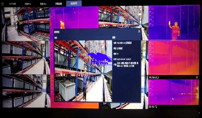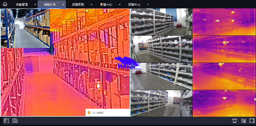 安全仓储监控应用 根据现场环境,选择不同形态红外热像仪(卡片机、球机、云台等),将设备安装在电池货架上,实现对向监测,设备轻巧,灵活部署安装,全天24小时在线温度监控,温度分布一目了然。对于超高型货架,还可以搭配机械垛手,实现7×24小时巡航监测,热失控提前预警,防患于“未燃”。 安全仓储监控应用—应用案例 某汽车产线pack堆放区应用:pack临时存放区域有大量电池包堆叠存放,有一定的安全隐患,采用云台式热成像仪,进行扫描测温;